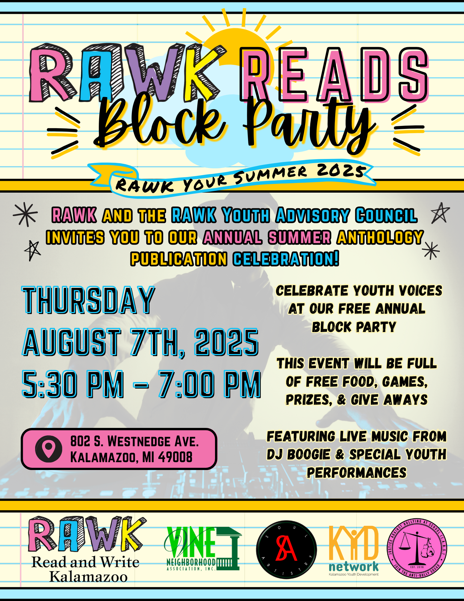 RAWK with us on Thursday, August 7th from 5:30 PM – 7:00 PM at our annual RAWK Reads Block Party hosted by our one and only Youth Advisory Council! Join us in the back parking lot at 802 S. Westnedge Ave. as we celebrate our youth, amplify their stories, and RAWK out the summer!