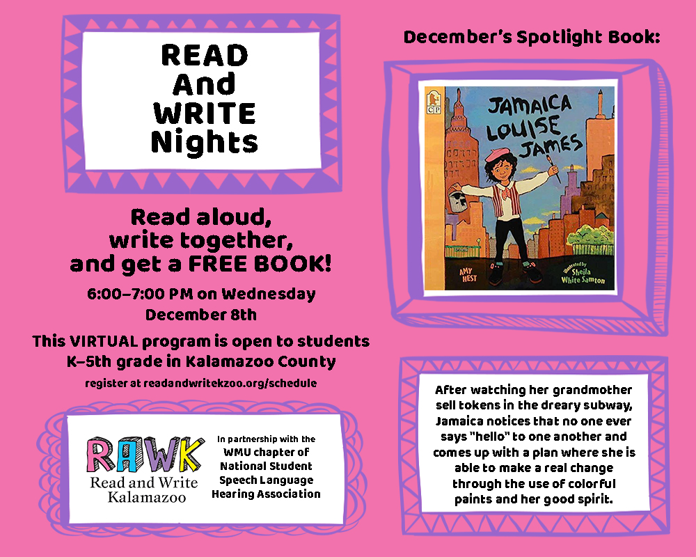 Kalamazoo County youth in grades K–5 are invited to join volunteers from the Western Michigan University chapter of the National Student Speech Language Hearing Association to spend time reading out loud then writing together to express their response to the story.
