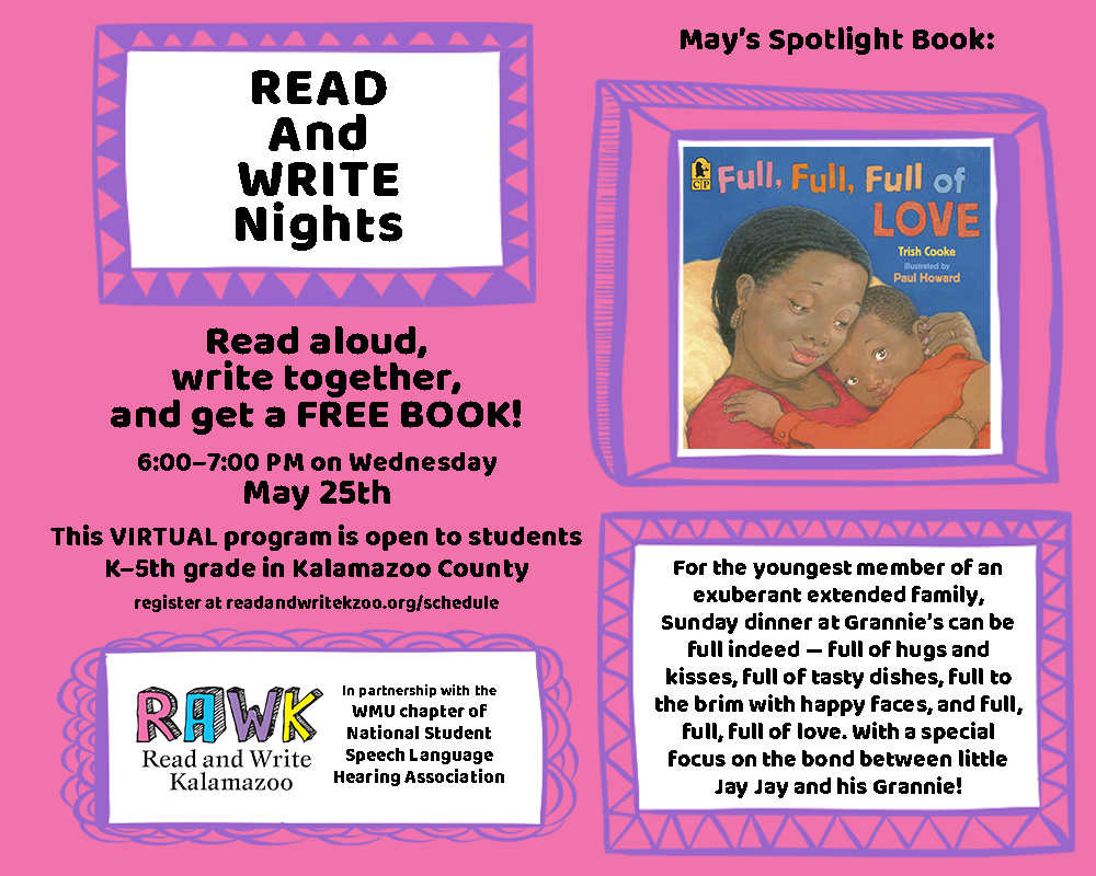 Kalamazoo County youth in grades K–5 are invited to join volunteers from the Western Michigan University chapter of the National Student Speech Language Hearing Association to spend time reading out loud then writing together to express their response to the story.